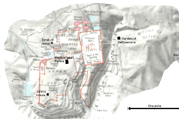 Joanna is with her husband in the old Hasmonaean Palace, residence of Herod Antipas. Also staying there is her friend Susanna. Most of the disciples have fled to Bethany. The rest are at Johns house in south Jerusalem, with the possible exception of Thomas, who may have gone further afield. |