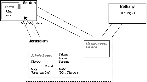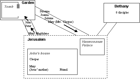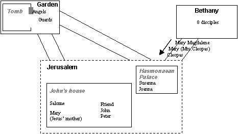 Cleopas remains at Johns house, whilst the two Marys, along with Salome, have called for Joanna and Susanna. The five women now head for the tomb to do the womens work of anointing the body. Meanwhile, the guards have recovered and are running back to tell the authorities of their experience. The angels are waiting inside the tomb. |