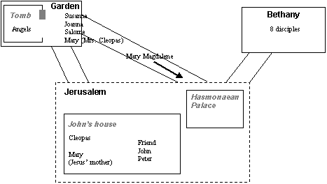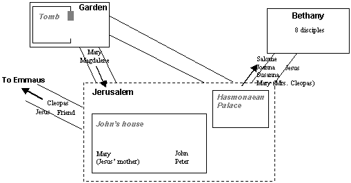 Two other people had also set out from Johns house in south Jerusalem. Jesus uncle Cleopas, having been told of the angels from the group of women (which included his own wife, Mary) set out with a companion to go to Emmaus. Whilst on the road they had the famous encounter that Luke has recorded in Luke 24:13-32. The information given by Cleopas in verses 22-24 exactly match what he would have known in this reconstructed account; he would have known of the womens encounter with two men in white, and of Peter and Johns experience of discovering the tomb empty. But he and his companion would have set out before Mary Magdalene had returned with the news of having actually seen and spoken to Jesus, and thus neither Cleopas or his friend would have had any idea that Jesus was risen and alive.