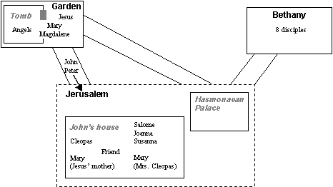 | Location of people on the night after the Sabbath (which finished at sunset) | |