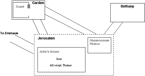 All the disciples, with the exception of Thomas, are gathered back in Jerusalem; either in Johns house, or that of John Mark. Jesus appears. Thomas, as yet still a sceptic, will later have his own meeting with Jesus (John 20:24-29); Luke, however, has telescoped the various appearances of Jesus into one. |