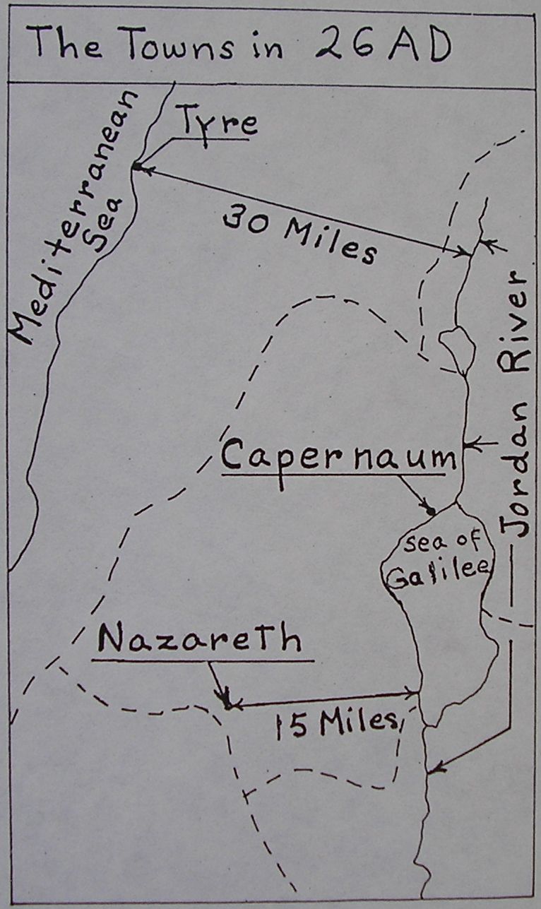 Nazareth is thus placed at the shore of the sea and Capernaum is inland. In reality, Capernaum is on the shore of the Sea of Galilee and Nazareth is more than 15 miles away as can be seen in Figure 1.