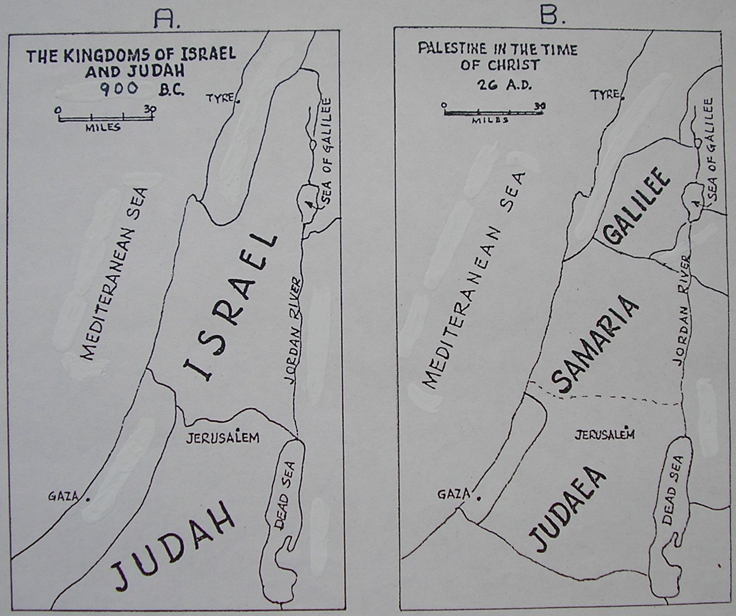 During the time of the kings from the tenth to the sixth century BC, Palestine was divided into the northern kingdom of Israel, and the southern kingdom of Judah, as can be seen in map A of Figure 2. In Jesus' day, the northern part of Palestine, formerly called Israel, was made up of two regions called Samaria and Galilee. One no longer spoke of Judah and Israel. One spoke of Judea, Galilee and Samaria. This can be clearly seen on map B in Figure 2.