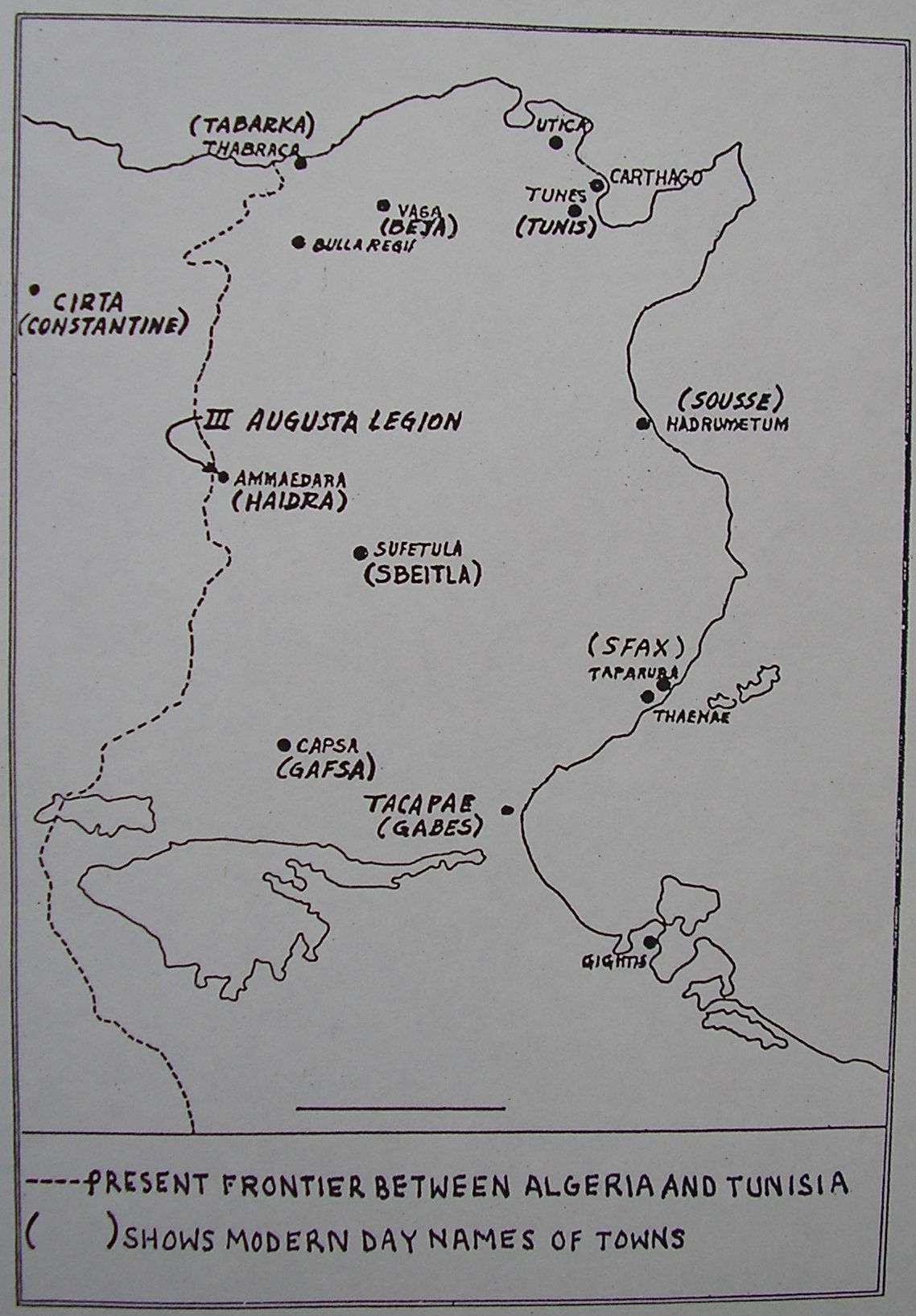 He goes on to say that at the time which interests us the legion was limited to Roman citizens (though this changed later), and the auxiliaries were recruited from provinces outside Africa. Many inscriptions have been found giving their names as coming from Spain, Chalcedon in Turkey, etc. During the reign of Tiberius the III Augusta legion was stationed at Ammaedara represented in present day Tunisia by a small village called Haïdra a few miles west of Thala on the Tunisian border with Algeria. At the same time they built a road from Tacapae (present day Gabès) to Ammaedara (Haïdra) to complete their system of roads which permitted quick displacement of troops to trouble points. Although southern Tunisia was not included in their area, a large section of Algeria over as far as Constantine was under their surveillance, as can be seen on the map in Figure 3. Finally, according to the same source,8 order was assured in Carthage the capital by one cohort of 600 men detached from the 3rd legion, and who acted under the authority of the proconsuls.