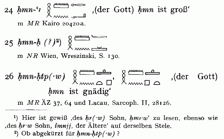 Moreover, there is another important observation that can be made. Look at entries No. 24 (for which Ranke gives the meaning “(the god) hmn is great”) and No. 26 (“(the god) hmn is merciful”). What does “hmn” stand for? The hieroglyph