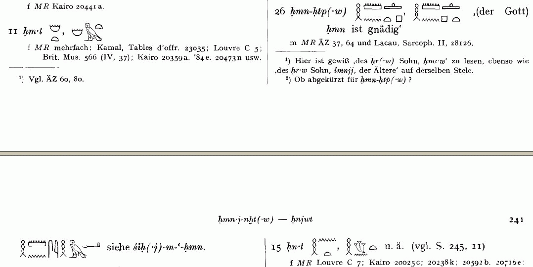 and the second name is entry No. 24 on page 240 which is already shown on the image displayed above. In other words, Wreszinski, who studied the inscription on this door post, also understood “hmn-h” to be a name related to two other names meaning “(the god) Hemen is ______”, and since “-h” is not a full word, i.e. it doesn’t mean anything, it must be an abbreviation (for an adjective which is a suitable attribute for a deity).