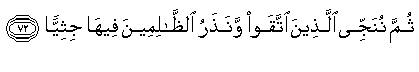 Kemudian Kami akan menyelamatkan orang orang yang bertaqwa dan membiarkan orang orang yang dzalim di dalam neraka keadaan berlutut. (QS. 19 Maryam 72)
