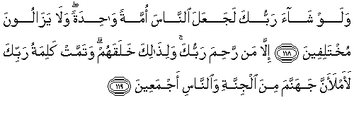 "Jikalau Tuhanmu menghendaki, tentu Dia menjadikan manusia umat yang satu, tetapi mereka senantiasa beselisih pendapat, kecuali orang orang yang diberi rahmat oleh Tuhanmu. Dan untuk itulah Allah menciptakan mereka Kalimat Tuhanmu (keputusan-Nya) telah ditetapkan sesungguhnya Aku akan memenuhi neraka jahanam dengan jin dan manusia yang (durhaka) semuanya." (QS. 11 Huud 118 - 119)
