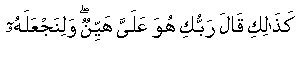 Maryam berkata, "Bagaimana akan ada bagiku seorang anak laki laki, sedang tidak pernah seorang manusiapun menyentuhku dan aku bukan (pula) seorang pezinah!" Jibril berkata: "hal itu adalah mudah bagiku; dan agar dapat Kami menjadikannya suatu tanda bagi manusia dan sebagai rahmat dari Kami; dan hal ini itu adalah suatu perkara yang sudah diputuskan."