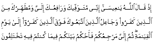 (Ingatlah!) tatkala Allah berfirman: "Hai Isa, sesungguhnya Aku akan mewafatkanmu, dan mengangkatmu kepada-Ku, dan akan mensucikan engkau dari orang orang kafir, dan menjadikan orang orang yang mengikutimu diatas mereka yang kafir hingga hari kiamat." (QS. 3 Ali Imraan - keluarga Imran -55)