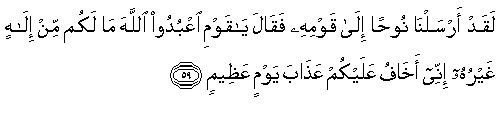 "Sesungguhnya kami telah mengutus Nuh kepada kaumnya lalu ia berkata:"Wahai kaumku,sembahlah Allah.Sesekali-kali tidak ada Tuhan bagimu selainNya"Sesungguhnya (kalau jiwamu tidak menyembah Allah),aku takut kamu akan ditimpahi azab pada hari yang besar (kiamat)". (QS. 7 Al A 'raaf-tempat tertinggi-59)