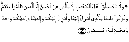 "Dan janganlah kamu berdebat dengan ahli-ahli kitab,melainkan dengan cara yang paling baik,kecuali dengan orang-orang zalim di antara mereka,dan katakanlah:"kami telah beriman kepada( kitab-kitab) yang diturunkan kepada kami dan yang diturunkan kepada kamu;Tuhan kami dan Tuhan kamu adalah satu;dan hanya kepadaNya kami berserah diri" (QS. 29 Al-Ankabuut -laba-laba-46).