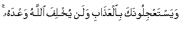 "Dan mereka meminta kepadamu disegerakan azab, dan Allah sekali kali tidak menyalahi janjiNya. Dan sesungguhnya satu hari disisi Tuhanmu adalah seperti 1000 tahun dari apa yang kamu hitung." (QS. 22 Al Hajj - haji- 47)