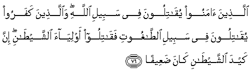 "Orang orang beriman berperanglah di jalan Allah dan orang orang kafir berperanglah di jalan thoghut (setan), Sebab itu perangilah pengikut pengikut setan….."