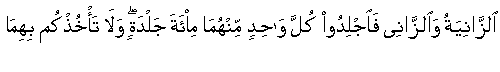 "Perempuan perempuan yang berzina dan laki laki yang berzina deralah masing masing seratus kali. Dan janganlah kamu belas kasihan kepada keduanya…."