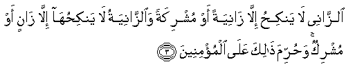 Laki laki yang berzina tidak nikah melainkan dengan perempuan yang berzina atau perempuan yang musyrik. Dan perempuan yang berzina tidak menikahinya melainkan laki laki yang berzina atau laki laki yang musyrik. Dan demikian diharamkan atas orang orang mukmin.