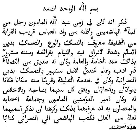 | It is related that in the time of ABDALLAH AL M�M�N. there lived a man of H�shimite descent, and of Abbasside lineage, nearly related to the CALIPH. The same was famed, among high and low, for devotion to Islam, and for the careful observance of all its ordinances. This person had a friend, learned and virtuous, endowed with the gifts of culture and science, of pure and noble descent from the BENI KINDA, and distinguished for his attachment to the Christian faith. The same was in the service of the Caliph, and nigh unto him in honour and dignity. Now these two men had a mutual love, and an implicit trust in the friendship of each other. AL M�M�N, Commander of the Faithful, moreover, and his whole |