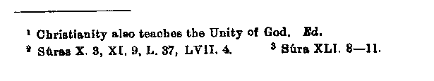 We must here set a distinct limit for ourselves, in order on the one hand that we may not drift away into an endless undertaking and attempt to expound the whole Quran; and on the other that we may not go off into another subject altogether and try to set forth the theology of the Quran; an undertaking which was begun with considerable success in the T�bingen Zeitschrift f�r Evang. Theol. 1881, 3tes Heft. Furthermore, certain general points of belief are so common to all mankind that the existence of any one of them in one religion must not be considered as