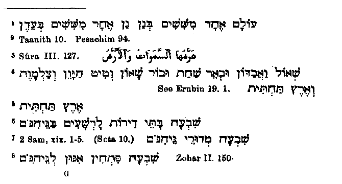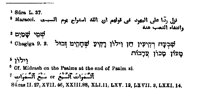 The idea of several heavens, which is indicated by the Biblical expression "heaven of heavens,"3 came to Muhammad probably from the Jews, also the notion that they were seven in number, a notion due to the different names applied to heaven. In Chagiga4 we find the assertion that there are seven heavens, and then the names are given. All these names occur in the Scripture except the first, viz. vilon, from the Latin velum.5 This name in which heaven is compared to a curtain, which veils the glory of God, is a very important one in the Talmud. Muhammad speaks often of the seven heavens,7 and in one passage he