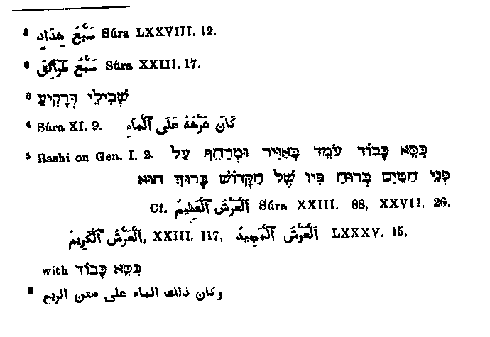 calls the heavens the seven strongholds1 and in another the seven paths.2 This last expression occurs also in the Talmud.3 During the creation, however, His throne was upon the waters.4 This idea also is borrowed from the Jews, who say:5 "The throne of glory then stood in the air, and hovered over the waters by the command of God." This is somewhat more clearly expressed by Elpherar who says: "And this water was in the middle of the air."6
