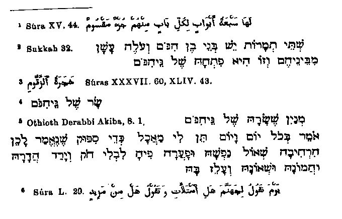 behind hand, for we read in one passage that1 "it (hell) hath seven gates, unto every gate a distinct company of them shall be assigned." According to the Jews, a tree stands at the entrance to hell:2 Two date palms grow in the valley of Ben Hinnom, smoke issues from between them and this is the entrance to hell"; but Muhammad knows a tree of hell called Al Zaqqum3 which serves sinners for food, about which he has much to relate. The step from such a definite idea of hell to the notion of a personality connected with it is an easy one, and we find such an individual mentioned by the Rabbis as the "prince of Gehinnom";4 he is called however in the Quran simply Jahannam. In one Rabbinical book5 we find the following: "That the prince of hell says daily, Give me food to satisfy me, comes from Isaiah, v. 14." Muhammad says similarly:6 "On that day We will say unto hell, 'Art thou full?' and it shall say 'Are there more'?"
