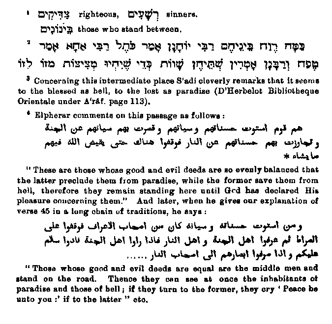 entitle them to the former nor condemn them to the latter place. Thus while the righteous1 found their place in Paradise, and the sinners had their portion in hell, those who belonged to neither class were placed in a space between Paradise and Hell, of which it is said in the Midrash on Ecclesiastes, vii. 14:2 How much room is there between them? Rabbi Jochanan says a wall; R. Acha says a span; other teachers however hold that they are so close together that people can see from one into the other."3 The idea just touched upon in this passage is most poetically worked out in Sura VII. 44,4 "And between the blessed and the damned there shall be a veil;