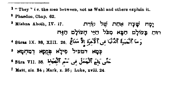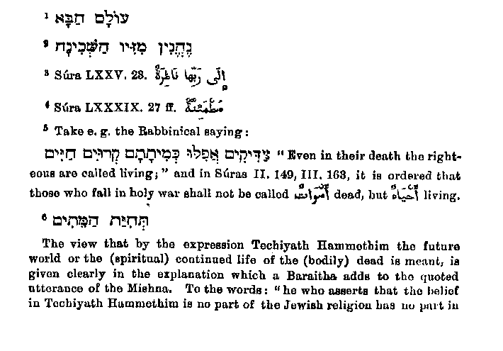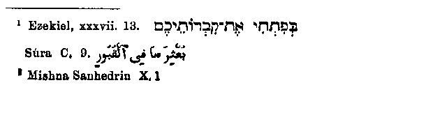 the doctrine of the day of judgment, the view of the resurrection and of the quickening of the dead was also formed; and this the more readily, because it found support in expressions in the Scripture, as e.g those in Ezekiel, xxxvii.:1 "I have opened your graves, and caused you to come up out of your graves, ye shall live," etc.; and those in other passages referring partly to the metaphorical quickening of the dead land of Israel. Of this doctrine it is said that it is such a fundamental teaching of the Jewish faith that the declaration that it did not belong to the law entailed the exclusion of him who thus spoke from eternal life.2 The Quran is, so to speak, founded upon this doctrine along with that of the unity of God, and there is scarcely a page in it where this doctrine is not mentioned. To adduce proofs here would be as easy as it would be useless; and indeed it is not required by our purpose, since Christianity also has inherited this view from Judaism, as is shown in the argument of Jesus in refutation of the Sadducees. Only one point deserves particular mention, because on the one hand it contains a detail adopted from Judaism, and on the other it shows the low level of thought at that time.