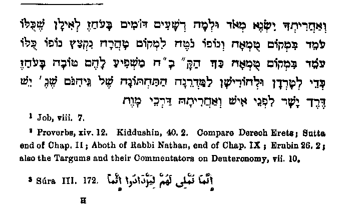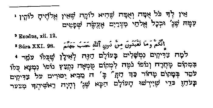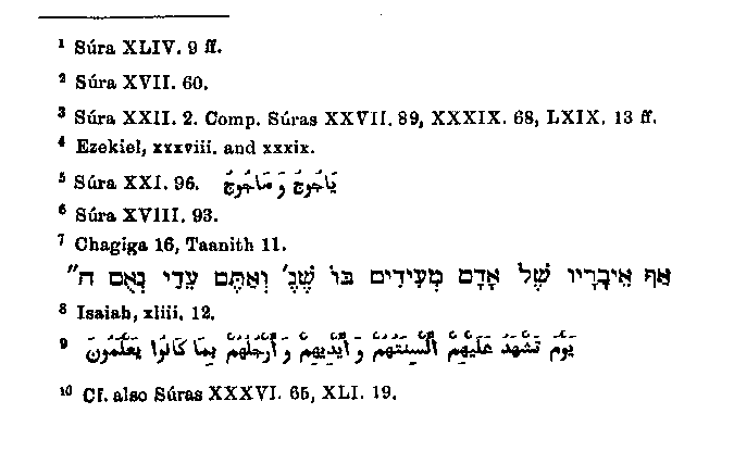 In the details of the idea of future retribution many resemblances are to be found, which, by virtue of the unity of the Jewish view and its derivation from the Scriptures, show themselves as borrowings from Judaism. Thus according to the Talmud, a man's limbs themselves shall give testimony against him;7 in one passage we find those words: "The very members of8 a man bear witness against him, for it is said: 'Ye yourselves are my witnesses saith the Lord.'" With this we may compare Sura XXIV. 24 9 "Their own tongues, and hands, and feet, shall one day be witness against them of their own doings.10 The judgment