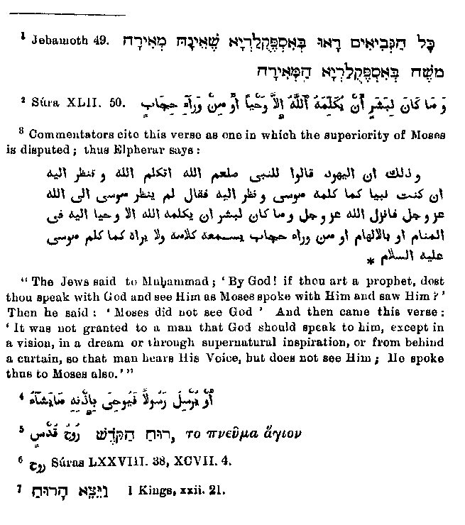 The Jews have a saying that "all tbe prophets saw through a dark glass, but Moses through a clear one,"1 and Muhammad says:2 It was not granted to a man that God should speak unto him otherwise than in a vision or from behind a veil;3 and then he adds4 "or by the sending of a messenger to reveal by His permission that which He pleaseth." This messenger is the Holy Spirit,5 or simply the spirit,6 like the spirit in the story of Micaiah's vision.7 The Arabic commentators take this holy spirit to mean Gabriel, a view which is not unknown to the Jews, for
