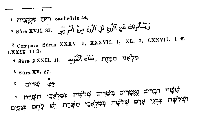 With this the teaching about angels is closely connected, and it also had its beginning in Scripture, but appears to have been developed in later days especially through Parseeism. Muhammad is unwearied in his descriptions of angels; so too are the later Jews in their many prayers on the day of atonement, but these are of rather late origin.3 The angel of death4 is specially mentioned in Sura XXXII. 11.