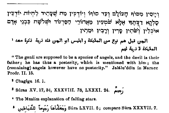 While angels were regarded as purely spiritual beings who execute God's commands, a class of beings was imagined who stood between man and the purest spirits; these were mixed spirits, who were made out of fire,5 who possessed superior mental powers, but who were mostly inclined to evil, they were called6 demons, but there are numerous other names for them in Arabic. The Talmud has the following statement about them:7 "Demons