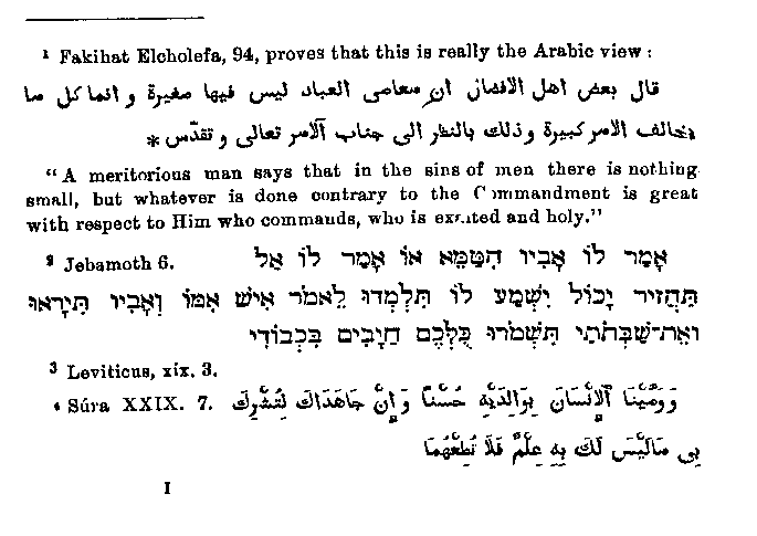 considered nothing which has to do with conduct under the heading A, even thongh it might be immediately connected with the points of belief under discussion and so we are able to bring together here all commands as to conduct. From the fact that every individual command is Divine, a conflict of duties may easily arise, which cannot be readily decided by private judgement, seeing that all the commandments are equal,1 so far as their Author is concerned. Rules for such cases must therefore be laid down. For instance, we find the following statement in the Rabbinical writings2 "If a father saith (to his son if be is a priest), 'defile thyself'; or if he saith, 'Make not restitution (of the thing found to the owner)', shall he obey him? Therefore, it is written3 'Let every man reverence his father and mother, but keep my Sabbaths all of you, ye are all bound to honour me'" And Muhammad says:4 "We have commanded man to show kindness towards his parents, but if they endeavour to prevail with thee to associate with me that concerning which thou hast no knowledge, obey them not."
