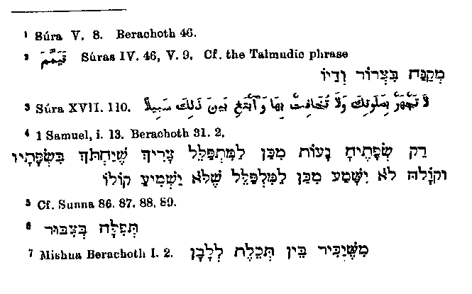 prayer before washing with water, which cleansing is recommended as a general rule before prayer both in the Quran1 and in the Talmud. Instead of water, purification with sand may take place.2 So in the Talmud: "He cleanses himself with sand and has then done enough." As concentrated thought is urged as a duty, it follows that prayer though audible must not be noisy,3 and so Muhammad says: "Pronounce not thy prayer aloud, neither pronounce it with too low a voice, but follow a middle way between these;" and in the Talmud we find:4 "From the behaviour of Hannah who in prayer moved her lips we learn that he who prays must pronounce the words, and also as her voice was not heard we learn that he must not raise his voice loudly." But because our mood does not at all times move us to fervency of prayer, outward ceremony is necessary, and indeed prayer in a great congregation, whose devotion will stir up our own.5 "The prayer in the congregation"6 is greatly praised also by the Jews. Daybreak, which is mentioned in the Talmud in connection with the Shema prayer, as the time when "one can distinguish between a blue and a white thread,"7 is not mentioned in this connection in the