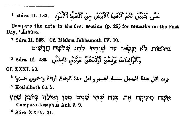 As Muhammad had very little intention of imposing a new code of individual laws, since his aim was much more the spread of new purified religious opinions, and as in the matter of practice he was far too much of an Arab to deviate from inherited usages, unless they came directly into opposition to these higher religious views, it is easily to be explained how so few borrowings are to be found in this part and much even of what is adduced might perhaps be claimed to be general oriental custom. We shall find moreover in the Appendix that Muhammad mentions many Jewish laws which were known to him; he alludes to these sometimes as binding on the Jews, sometimes merely for the sake of disputing them, and hence we see that it was not want of knowledge of them that kept him back from using them, but his totally different purpose. This remark must apply also to our third heading, under which isolated instances of adaptation only will be found, except in cases where the view is directly connected with the higher articles of Faith adopted from Judaism, which have been already mentioned.