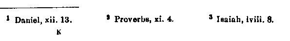 wealth which he loves avails not, he cannot give to God a ransom for him, for the redemption of their soul is costly and must be let alone for ever; but enter thou into peace, rest in thy lot till the end of days.1 May thy part be with the righteous.' When the man sees this, he collects his treasures and says to them: 'I have laboured for you day and night, and I pray you redeem and deliver me from this death' but they answer: 'Hast thou not heard that riches profit not in the day of wrath?2 So then he collects his good works and says to them 'Then you come and deliver me from this death, support me, let me not go out of this world, for you still have hope in me if I am delivered.' They answer: 'Enter into peace! but before thou departest we will hasten before thee; as it is written, Thy righteousness shall go before thee, the glory of the Lord shall be thy reward.'"