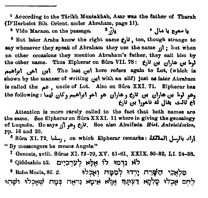 and then the Greek Athar was easily converted into the Arabic Azar.1 The reason which is given by some Arabic commentators2 is ridiculous. They maintain that Azar is like Yaszar3 and that this means:4 "O, perverted one, O, erring one;" and Abraham is supposed to have thus addressed his idolatrous father.5 We now pass on to the more mature married life of Abraham and come to him meeting with the angels,6 whom he receives as guests.7 Abraham took them for Arabs, was much surprised that they did not eat and stepped back in fear, whereupon they announced to him that he would have a son and told him also of the coming destruction of Sodom. In one passage of the Talmud8 we read: "They appeared to him nothing else but Arabs;" and in another passage9 it is said