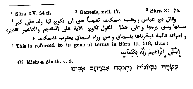 "The angels descended and ate. They ate? No, but it appeared as though they ate and drank." There is only one error to be found in the account as given in the Quran. The doubt as to whether in the advanced age of the pair a son could come into the world (which in other passages and in the Bible is put into the month of Sarah) is here uttered by Abraham, but in very mild words.1 It is true that in the other Biblical account of the promise to Abraham, he himself is represented as doubting God's word.2 In other passages the position of words and clauses might give rise to many errors, if we did not know the story better beforehand from the Bible. Thus in one passage3 the laughter of Abraham's wife is given before the announcement is made, which leads the Arabic commentators to manifold absurd guesses. Elpherar by the side of these explanations (many of them quite wanting in truth) gives the right one in the following words:4 "Bin 'Abbas and Wahib say: 'she laughed from astonishment that she should have a child, for both she and her husband were of a great age. Then the verse was transposed, but it ought to run thus: 'And his wife stood while We promised him Isaac, and after Isaac, Jacob, and then she laughed.'" It might seem that this son who was promised to Abraham was with deliberate forgery identified with Ishmael, because he is regarded as the ancestor of the Arabs; and so too the ensuing temptation5 connected with the sacrifice of his son is made to refer to Ishmael.