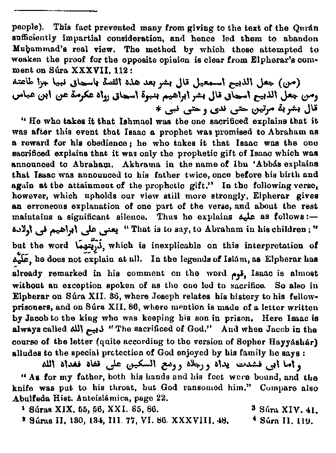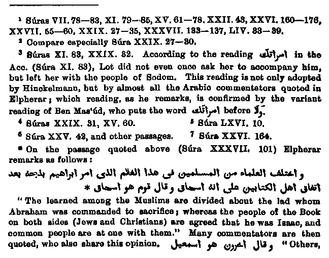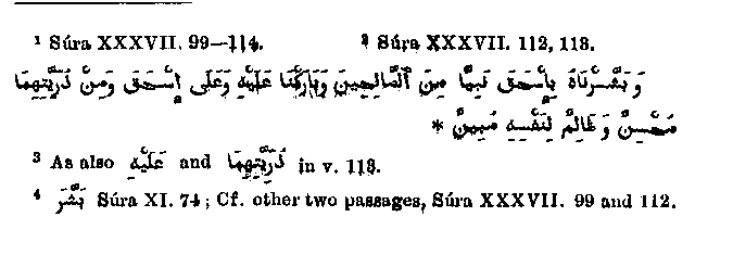 Ground for this acceptation is given in another passage,1 when after the dispute about the idols has been related, we read from v.99 as follows: "Wherefore We acquainted him that he should have a son who should be a meek youth, and when he had attained to years of discretion Abraham said unto him: 'O, my son! I saw in a dream that I should offer thee in sacrifice.'" He declared himself ready, on which Abraham heard a voice telling him that he had already verified the vision; and a noble victim ransomed him. And then the passage continues2 "And We rejoiced him with the promise of Isaac, a righteous prophet; and We blessed him and Isaac; and of their offspring were some righteous doers, and others who manifestly injured their own souls." That the announcement of Isaac first appears here is a proof that the preceding context3, refers to Ishmael. It is therefore evident that according to Muhammad's representation the sacrificial action was performed on Ishmael, and further on this will be shown more in detail. But it is not clear that the announcement of the angels refers to him, seeing that in one of the three places where the same word4 is used of this angelic announcement, it is explicitly applied to Isaac. That the angels had a two-fold mission - (1) to Abraham, in order to show him his fatherhood and the destruction of Sodom, and (2) to Lot, in order to remove him from Sodom before the destruction was accomplished, is Biblical and Muhammad follows the Bible narrative. We have already mentioned that Lot is supposed to have
