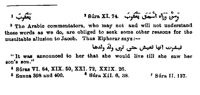 We are now struck by the strange confusion which seems to have existed in Muhammad's mind about Jacob.1 He seems to have been uncertain whether he was Abraham's son, or his grandson, the son of Isaac. While there is no passage which says explicitly that he was Abraham's son, yet this idea is conveyed to all who have not learned differently from the Biblical history. In the angel's announcement2 it is said, "after Isaac, Jacob;3 and in other passages4 we read: "We gave to him (i.e. to Abraham) Isaac and Jacob. In the Sunna, however, Joseph is called clearly the grandson and Jacob the son of Abraham.5 Although these passages do not prove the point absolutely, yet those passages which can be brought forward in support of the opposite view are much less powerful. For if it must be allowed that in two passages6 Abraham and Isaac, and in one of these Jacob also, are mentioned as the forefathers of Joseph we can also shew another passage where Ishmael is mentioned as a forefather of Jacob without any continuous genealogy having been given. And farther, since in the passage last cited Abraham, Ishmael and Isaac are counted as the fathers of Jacob, it is clear from the mention of Ishmael among the others how great was the confusion which reigned in Muhammad's mind about Jacob's parentage.