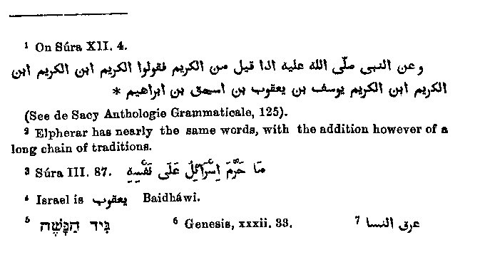 between the two was not clear to him. This error did not spread; on the contrary, the later Arabs were better acquainted with these relationships. Thus, e.g., Zamakhshari1 says: "It is related of the prophet that he said, If you are asked, who is the noble one?' answer: 'The noble one, the son of the noble one, the son of the noble one, the son of the noble one is Joseph, the son of Jacob, the son of Isaac, the son of Abraham.'"2 But this is no testimony to the fall certainty of Muhammad himself, for often the traditions spread among the later Arabs are more correct than those given in the Quran, as we said before in the case of the sacrifice of Isaac. Only a little is given of Jacob's life. There is an allusion to his wrestling with the Angel in the following words3 "All food was allowed to the children of Israel before the revelation of the Law, except what Israel (as he is here called)4 forbade himself." This is evidently an allusion to the Biblical passage where the prohibition against eating the sinew of the thigh5 is mentioned,6 which Baidhawi7 also gives, but assigns a wrong reason for it. Beyond this allusion and the history of Joseph, in which he is also involved and which we will give later on, the only other thing told about Jacob is his admonition before his death. This is