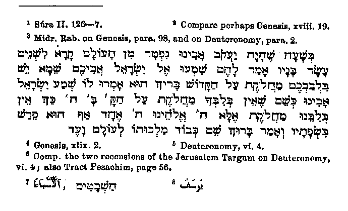 given in accordance with rabbinical sources follows1 "And Abraham commanded this to his sons,2 even to Jacob: 'My children, verily God hath chosen this religion for you, therefore die not unless ye also be resigned.' Were ye present when Jacob was at the point of death? When he said to his sons, 'Whom will ye worship after me?' they answered: 'We will worship thy God and the God of thy fathers Abraham and Ishmael and Isaac, one God, and to him will we be resigned.'" We find something similar in the Rabbinical writings:3 "At the time when Jacob was leaving the world, he called his twelve sons and said to them: 'Hear your father Israel,4 is there any doubt in your hearts about God?' they said: 'Hear Israel our father, as in thy heart there is no doubt about God, so also there is in ours; but the Lord is our God, the Lord is one.'5 Then he spoke out and said: 'Praised be the name of his glorious kingdom, for ever.'"6 The sons of Jacob are not individually mentioned, but they appear in the list of the Patriarchs as "the tribes,"7 so called because of the subsequent division into tribes; Joseph8 alone enjoying an honorable exception.