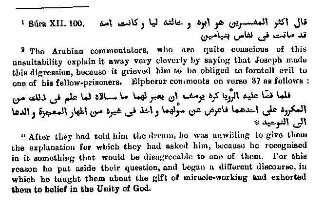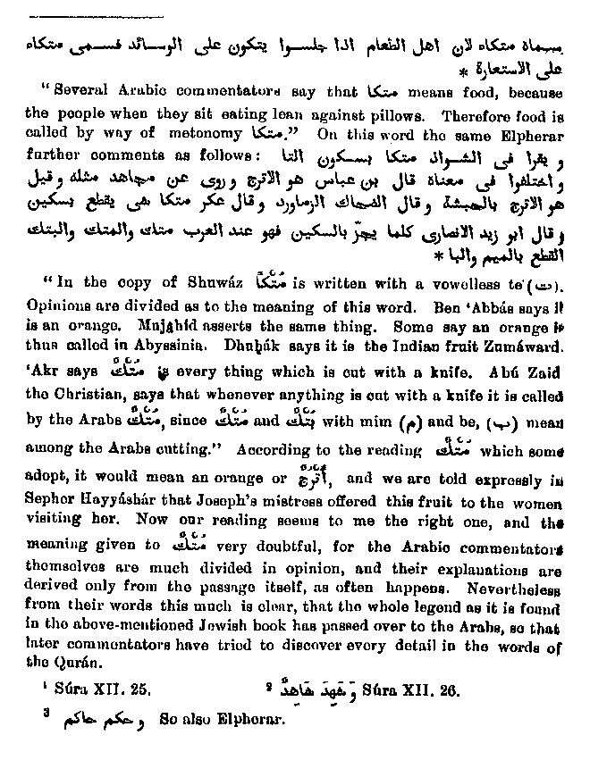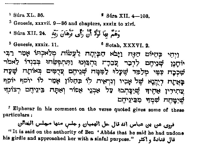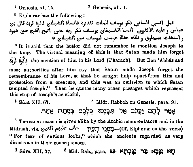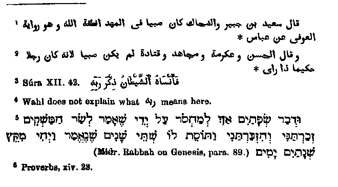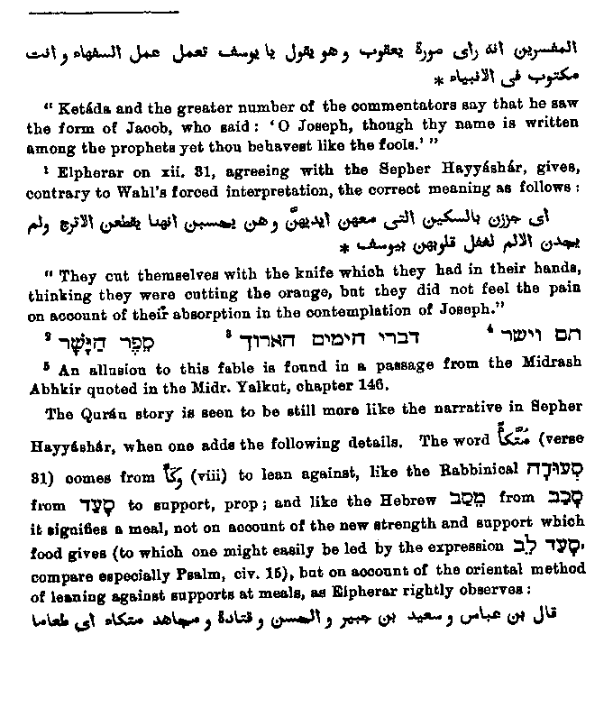 who was present at what occurred between Joseph and the woman, and some of the commentators quoted in Elpherar express themselves quite in harmony with the Sepher Hayyashar as follows:1 "Sa'id Ben Jabair and Dhubak say it was a child in the cradle which God permitted to speak. This is the tradition of the Uphite commentator according to 'Abba's." In the Sepher Hayyasbar it is also asserted that there was present a child of eleven months who till then could not talk, but then attained to speech. But there is a difference in that the Jewish book makes the child confirm the utterance of Joseph, while the Arabic commentator puts into its mouth the decision about the rent clothing, while other Arabic writers reject as highly unsuitable. Many commentators say that this was no child,2 but rather a wise man full of penetration. It follows from this that Muhammad either mired the two legends inappropriately, or else that the second one came later into Arabic tradition and was read by the Arabs into the words of the Quran. The words3 which Wahl translates: "But the devil would not allow it4 that he (the cap-bearer) thought of him (Joseph)," are explained by the following passage:5 "The talk of the lips tendeth only to penury,6 because although Joseph reminded the