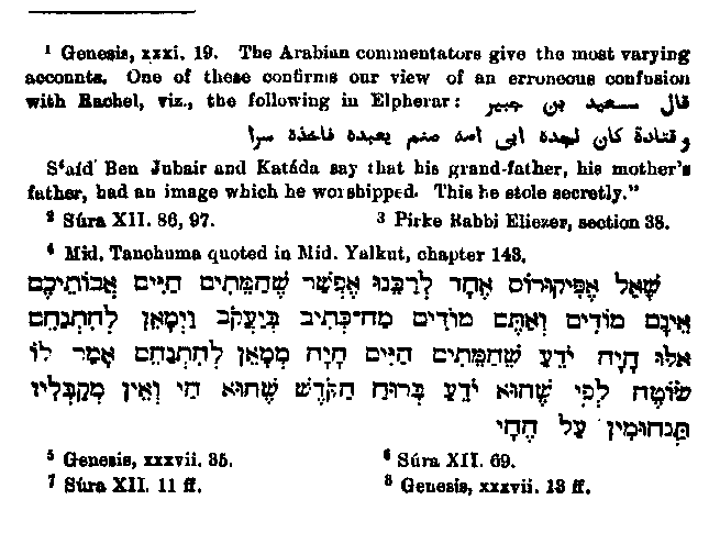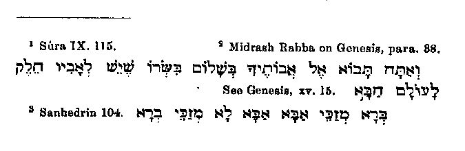 This view is certainly not Jewish, but at the same time it is not contrary to Judaism, for the Rabbis tell us1 that by the utterance "Thou shalt be buried in a good old age (Genesis, xv. 15.) God showed Abraham that Ishmael would repent." And in the Talmud it is said2 that Ishmael repented during his father's life-time. From his habit of reckoning Ishmael among the patriarchs, Muhammad fell into the error of counting him as an ancestor of Jacob. Thus in one passage3 he says: "The God of thy fathers, Abraham and Ishmael and Isaac," which Baidhawi attempts to explain in the following manner;4 "He counts Ishmael among his ancestors, connecting him with the father - the grand-father also is the same as the father - and as Muhammad says, The uncle is a part of the father. Then pointing to 'Abbas, his uncle, he said, This is the survivor of my forefathers."