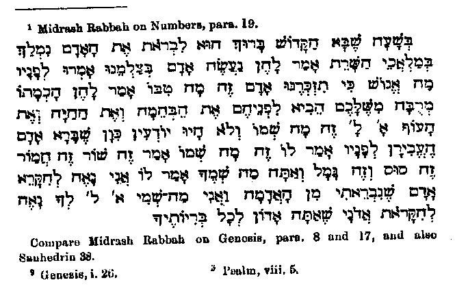 created man He caused the animals to pass before him and asked him for their names, and he replied: 'This is an ox, that an ass, this a horse and that a camel.' 'And what art thou called?' 'It is fitting that I should be called earthy, for I am formed of the earth.' And 'Thou art called LORD, for thou rulest all Thy creatures."3 From this arose the other legend1 that God, after the creation of man, commanded the angels to fall down before him, which they all did except Iblis,2 the devil. The legend bears unmistakeable marks of Christian development, in that Adam is represented in the beginning as the God-man, worthy of adoration, - which the Jews are far from asserting.3 It is true that in Jewish writings great honour is spoken of as shewn by the angels to Adam, but this never went so far as adoration; indeed when this was once about to take place in error, God frustrated the action. We find in Sanhedrin 29,4 "Adam sat in the Garden of Eden, and the angels roasted flesh for him, and prepared cooling wine"; and in another passage it is said,5 "After God had created man, the angels went astray in regard to him, and wanted to say before him,