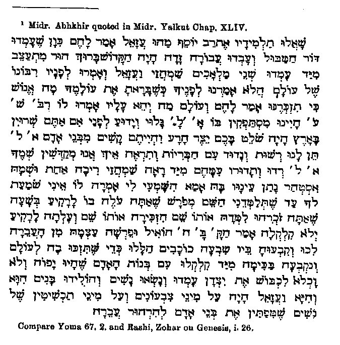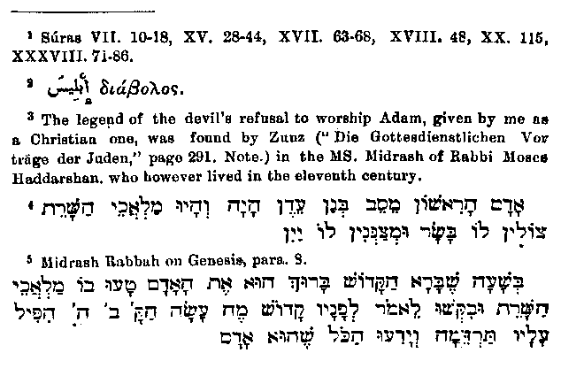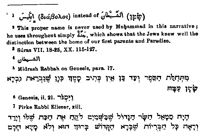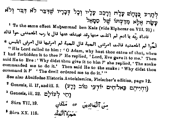 O Holy one! then God permitted sleep to fall on him, and all knew that he was of earth." In favour of the Christian origin of this narrative we must count the fact that the name used by Christians for the devil is the one used in all the passages referred to instead of the general Hebrew name.1 From this event according to Muhammad arises the hatred of the Devil against the human race, because on their account he became accursed of God; and so his first work was to counsel man in the Garden of Eden2 to eat of the tree of knowledge.3 In this narrative the Devil is again given his Hebrew name,4 and yet the first explanation of the temptation through the snake as coming from the Devil seems to be entirely Christian, as no such reference is to be found in the older Jewish writings; the passage quoted below can only be regarded as a slight allusion:5 "From the beginning of the book tip to this point6 no Samech is to be found; as soon however as woman is created, Satan (with the initial letter Sin like Samech) is created also." Still we find in a book which, though forged, is undoubtedly old,7 the following statement: