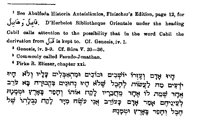 only one event in the life of Cain and Abel is depicted. This is depicted for us quite in its Jewish colours. In this passage, and indeed throughout the Quran, they are called sons of Adam, but in later Arabic writings1 their names are given as Qabil and Habil, which are clearly chosen out of love for the rhyming sounds. The one event mentioned is their sacrifice and the murder which it led to.2 Muhammad makes them hold a conversation before the murder, and one is likewise given in the Jerusalem Targum3 on the strength of the words in Genesis, "Cain said unto Abel his brother." Still, the matter of the conversation is given so differently in each case that we do not consider it worth while to compare the two passages more closely. After the murder, according to the Quran, God sent a raven which scratched the earth to shew Cain how to bury Abel. What is here attributed to Cain is ascribed by the Jews to his parents, and in a Rabbinical writing we find the following passage:4 "Adam and his companion sat weeping and mourning for him (Abel) and did not know what to do with him, as burial was unknown to them. Then came a raven, whose companion was dead, took its