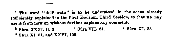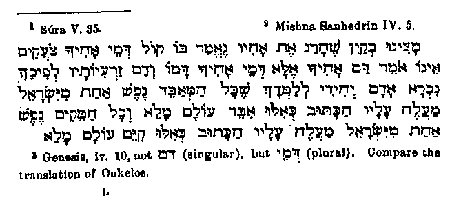 body, scratched in the earth and hid it before their eyes; then said Adam, I shall do as this raven has done, and at once he took Abel's corpse, dug in the earth and hid it.1" In the Quran a verse follows I which, without knowledge of the source from which it has come, seems to stand in no connection with what has gone before, but which will be made clear by the following explanation. The verse according to my translation runs thus: "Wherefore we commanded the children of Israel, that he who slayeth a soul, without having slain a soul, or committed wicked-floss in the earth, shall be as if he had slain all mankind but he who saveth a soul live, shall be as if he had saved the lives of all mankind." One perceives here no connection at all, if one does not consider the following Hebrew passage:2 "We find it said in the case of Cain who murdered his brother: The voice of thy brother's bloods crieth.3 It is not said here blood in the singular, but bloods in the plural, i.e., his own blood and the blood of his seed. Man was created single in order to show that to him who kills a single individual, it shall be reckoned that he has slain the whole race; but to him who preserved the life of a single individual it is counted that he hath preserved the whole race." By this comparison it is made clear what led Muhammad to this general d igression; he had evidently received this rule from his informants when they related to him this particular event. Another
