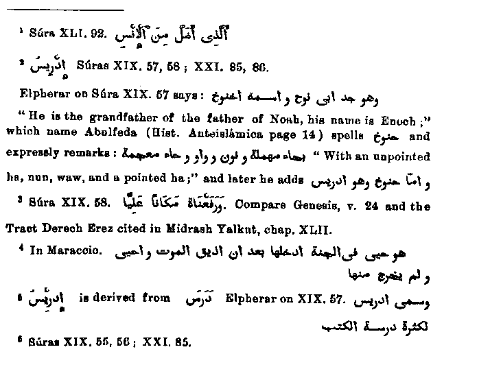 allusion to Cain is found in the Quran in a passage where he is called the man "who has seduced among men."1 No one else is mentioned in this period excepting Idris2 who, according to the commentators, is Enoch. This seems probable from the words,3 "And we uplifted him to a place on high," and also from a Jewish writing in which he is counted among the nine who went to Paradise alive. Jalalu'ddin brings this point even more prominently forward4 "He lived in Paradise where he had been brought after he had tasted death; he was quickened however, and departed not thence again." He appears to have gained his name5 on account of the knowledge of tbe Divine Law attributed to him. Elpherar remarks: "He was called Idris (searcher) on account of his earnest search in the revealed Scriptures." It is remarkable that in both these passages of the Quran6 he is mentioned after Ishmael.
