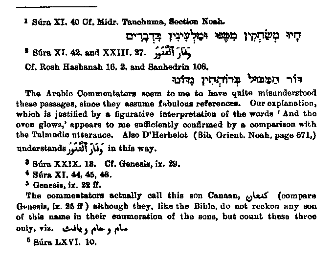also accord with Rabbinical tradition, e.g., "The people laughed at the ark,"1 accords with "They mocked and laughed at him in their words." "The waters of the Flood were hot,"2 with "The generation of the deluge was punished with hot water." Still many inaccuracies and perversions are to be found; for instance, Muhammad makes Noah to have lived 950 years before the Flood,3 whereas this is really the whole term of his life; and he represents one of Noah's sons as disobedient to him, and states that this same son did not follow him into the Ark, but believed himself safe on a mountain peak.4 This idea probably arose from a misunderstanding of Ham's evil conduct after the Deluge.5 Muhammad also makes out Noah's wife to have been unbelieving,6 although he is silent as to wherein her unbelief consisted, and I can find no reason for this statement, which is not mentioned either in the Bible or in the Rabbinical writings.