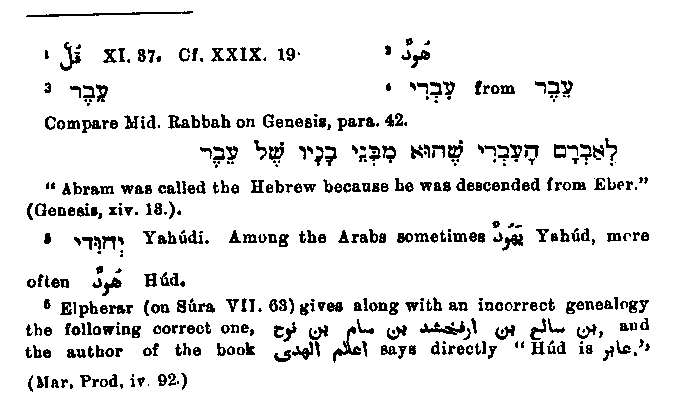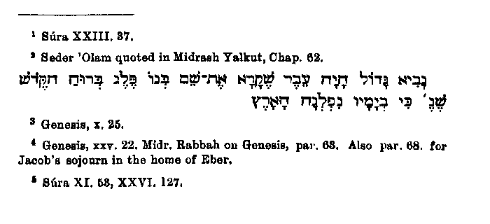 the new punishment is described, which would not have been accorded to a fiction. It appears therefore that the history reached this development in the mouth of the people, who delight in minute descriptions of punishment. The remaining deviations and additions, particularly the latter, are caused, as we have already remarked in the case of Noah, by confusion with Muhammad's own time and person. This is the case when he transfers unbelief in the resurrection to the time of Hud and counts it among the sins of that time which were worthy of punishment.1 This is seen too especially in the great importance assigned to Eber and to his desire to turn the people from their evil ways. Decided traces of this are certainly to be found in Jewish writings,2 where we are told that Eber was a great prophet, who by the Holy Spirit called his son Pelag, because in his days the earth was divided3 (which Eber had known beforehand). Much also is said of the school of Eber, and Rebekah is said to have gone there; for it is written: "She went to enquire of the Lord,"4 and Jacob is supposed to have stayed there for fourteen years. But of the fact that Eber preached to the people, he being their brother (on which Muhammad places great stress, because he himself was sent as an Arab to the Arabs), not a trace is to be found, still less of the fact that he took no reward from them.5 One point still remains to be cleared up, why the race under discussion is called in the